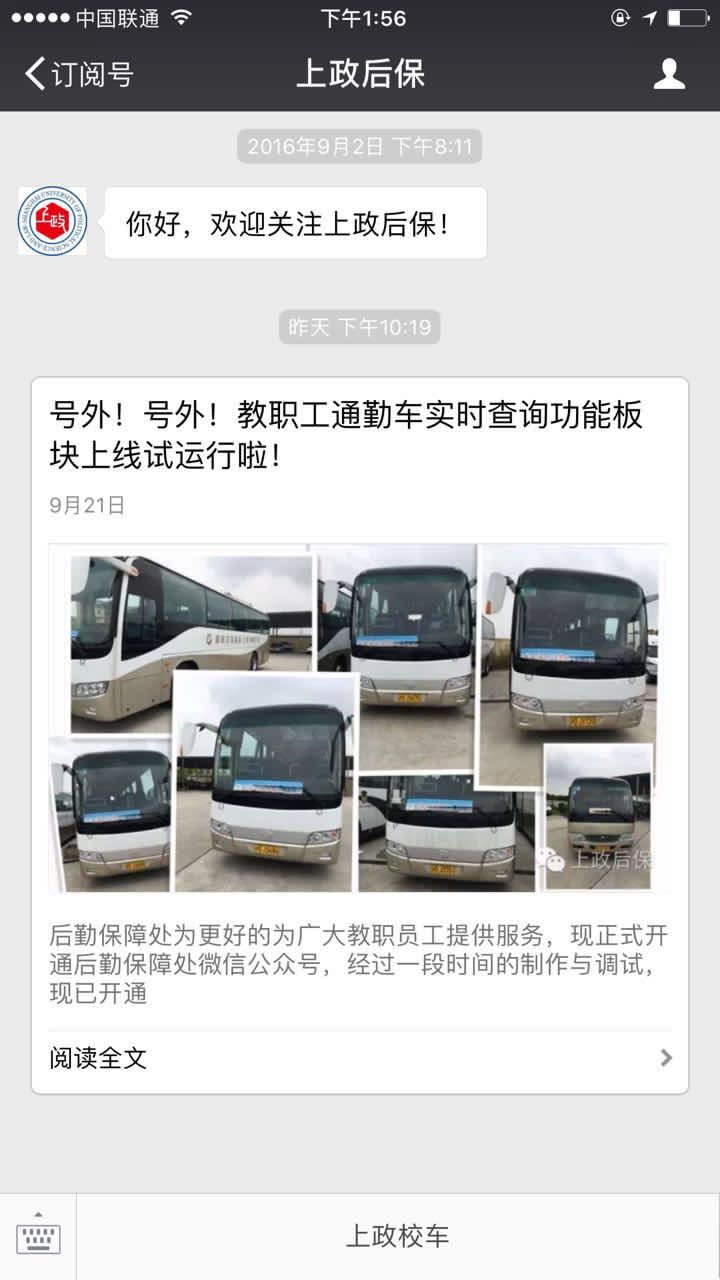 后勤保障处为更好的为广大教职员工提供服务,适应新时期网络信息化发展的需要,经过前期两个多月的准备,现正式开通后勤保障处微信公众号。公众号已加入教职工通勤车实时查询功能板块并上线试运行。同时,正在开发更多板块,配合实体工作,实现真正的方便广大教职工。 后勤保障处2016年9月22日