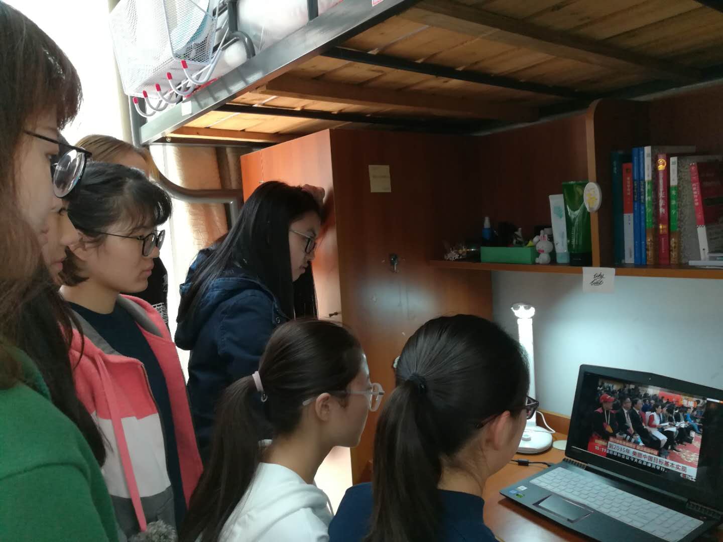 10月24日,中国共产党第十九次全国代表大会圆满完成各项议程后,在北京顺利闭幕。10月25日中午11点45分,选举产生的新一届中共中央政治局常委在人民大会堂同中外记者见面。在我校学生社区,来自不同楼宇的同学们都早早地围坐在寝室电脑前认真收看见面会的直播。