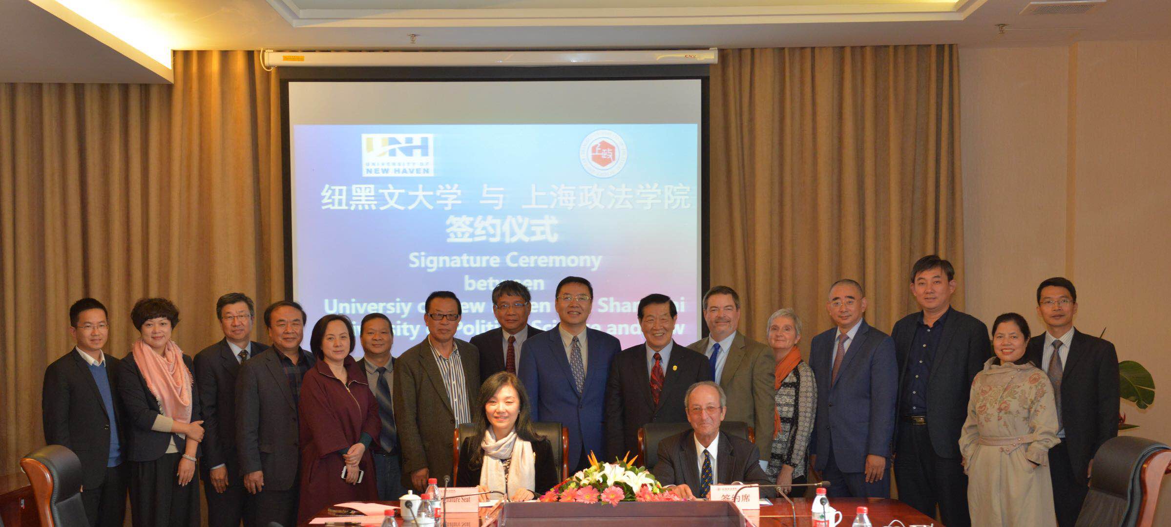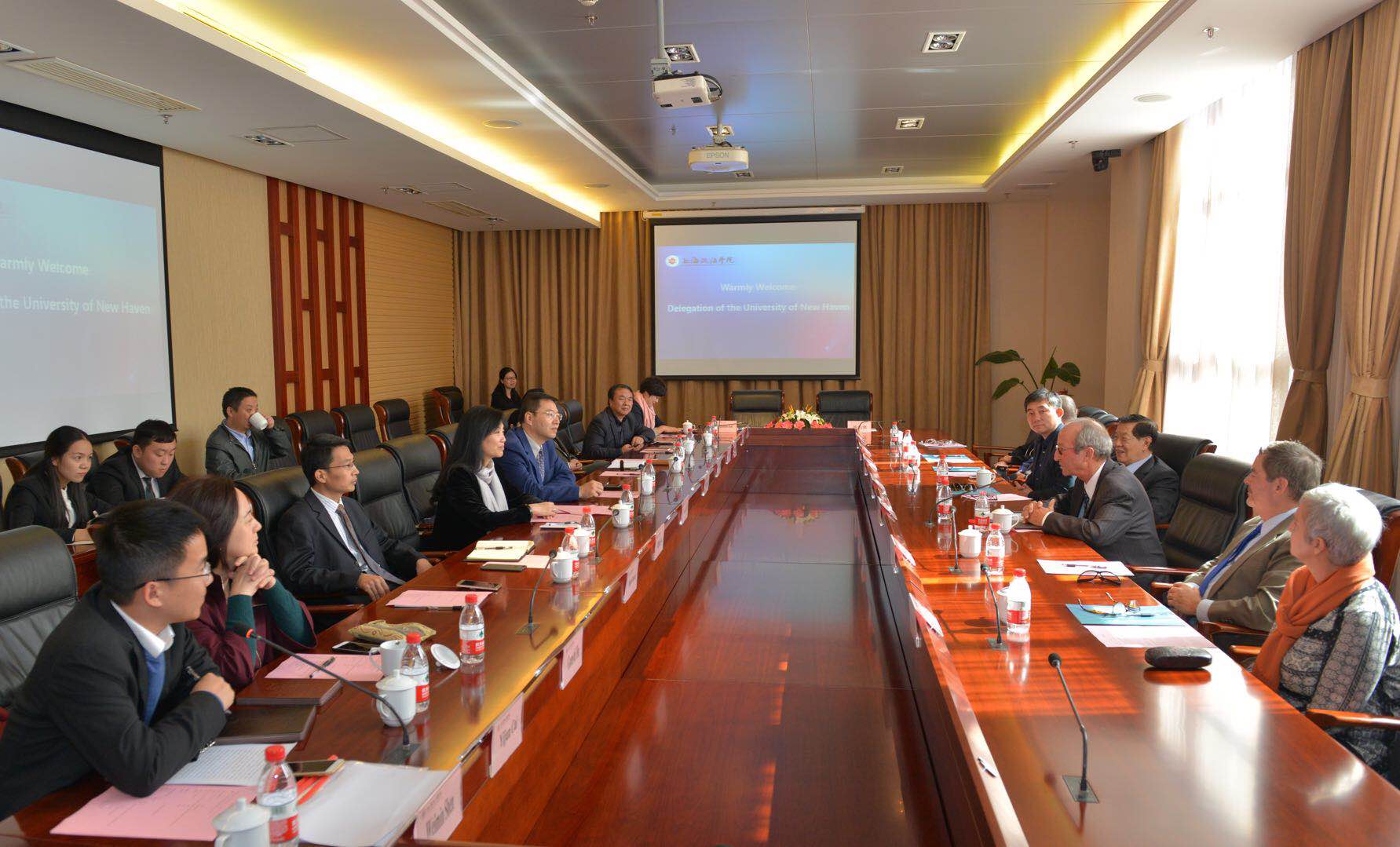 会谈过后,两校举行签约仪式。刘晓红代表我校同纽黑文大学签订合作备忘录。随后与会各方一同参观学校图文信息中心、纪录片实验室以及上合组织培训基地。