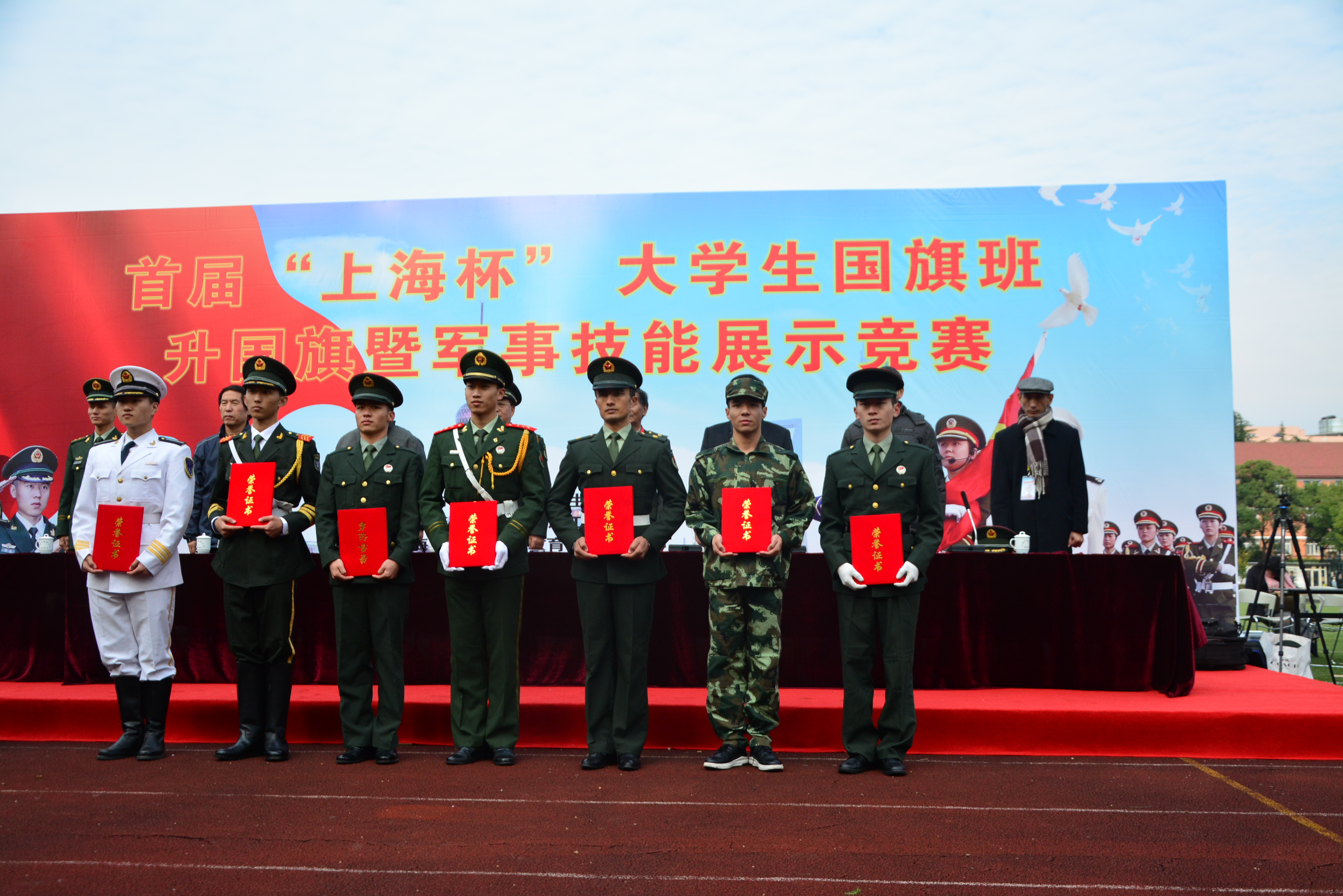 最后,首届“上海杯”国旗班升国旗暨军事技能比赛在颁奖音乐声中落下帷幕。我校军魂团代表20名学生参加在升国旗仪式和队列会操两个项目中均荣获三等奖,展示了我校学生良好精神面貌和爱国情怀。