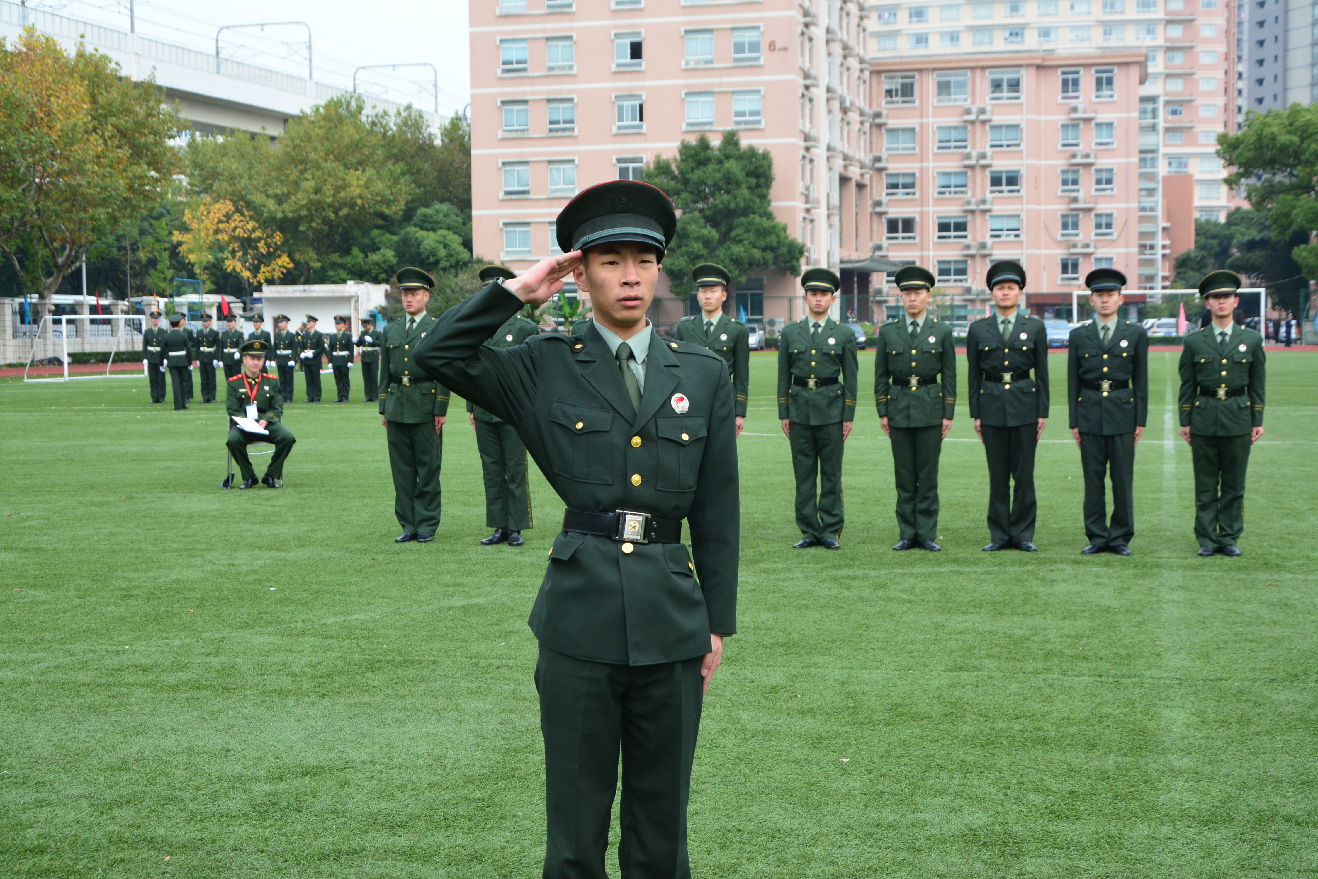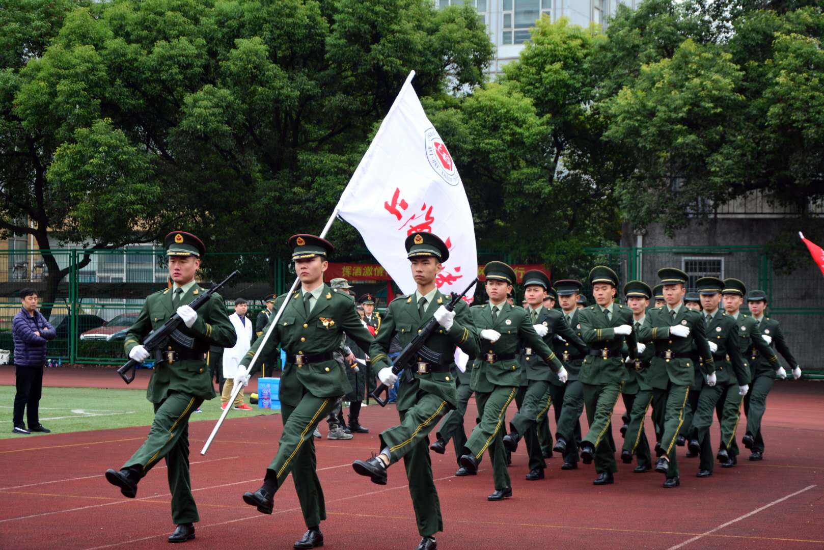比赛的红跑道上,我校军魂团学生身姿气宇昂扬,起步、正步、每一次摆臂,每一次踢腿都铿锵有力,每一次呐喊都宣示着当代大学生永不服输的韧劲;升旗台上,大家整齐着装,空中红旗猎猎,飘扬着的除了争取荣誉的决心,更是心中对祖国的热爱;绿茵草上,队列会操展示,立正稍息、跨立、起步正步跑步、戴帽敬礼礼毕,干脆连贯的动作,无一不体现着我校大学生严格要求自己、严谨作风的优良品质。