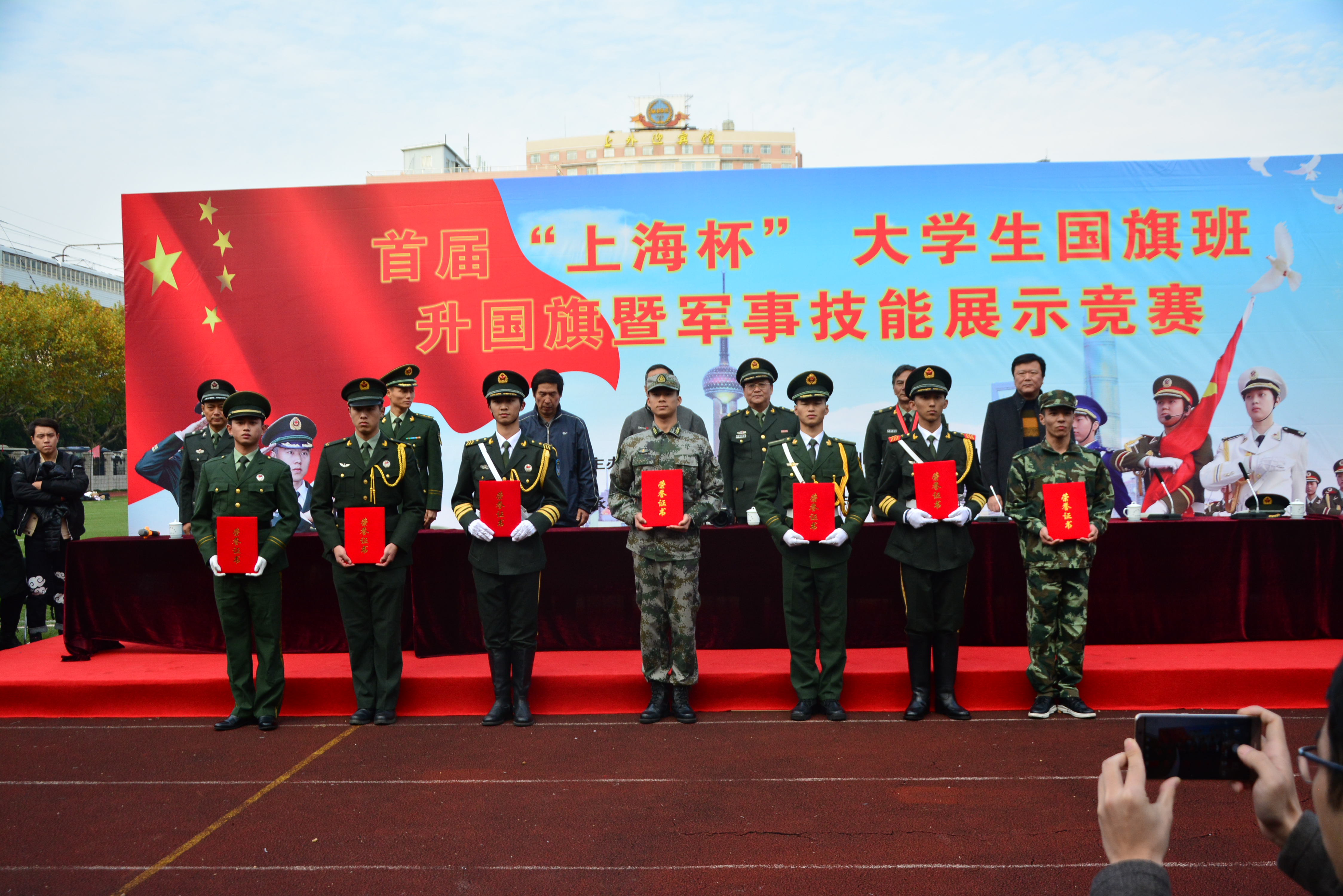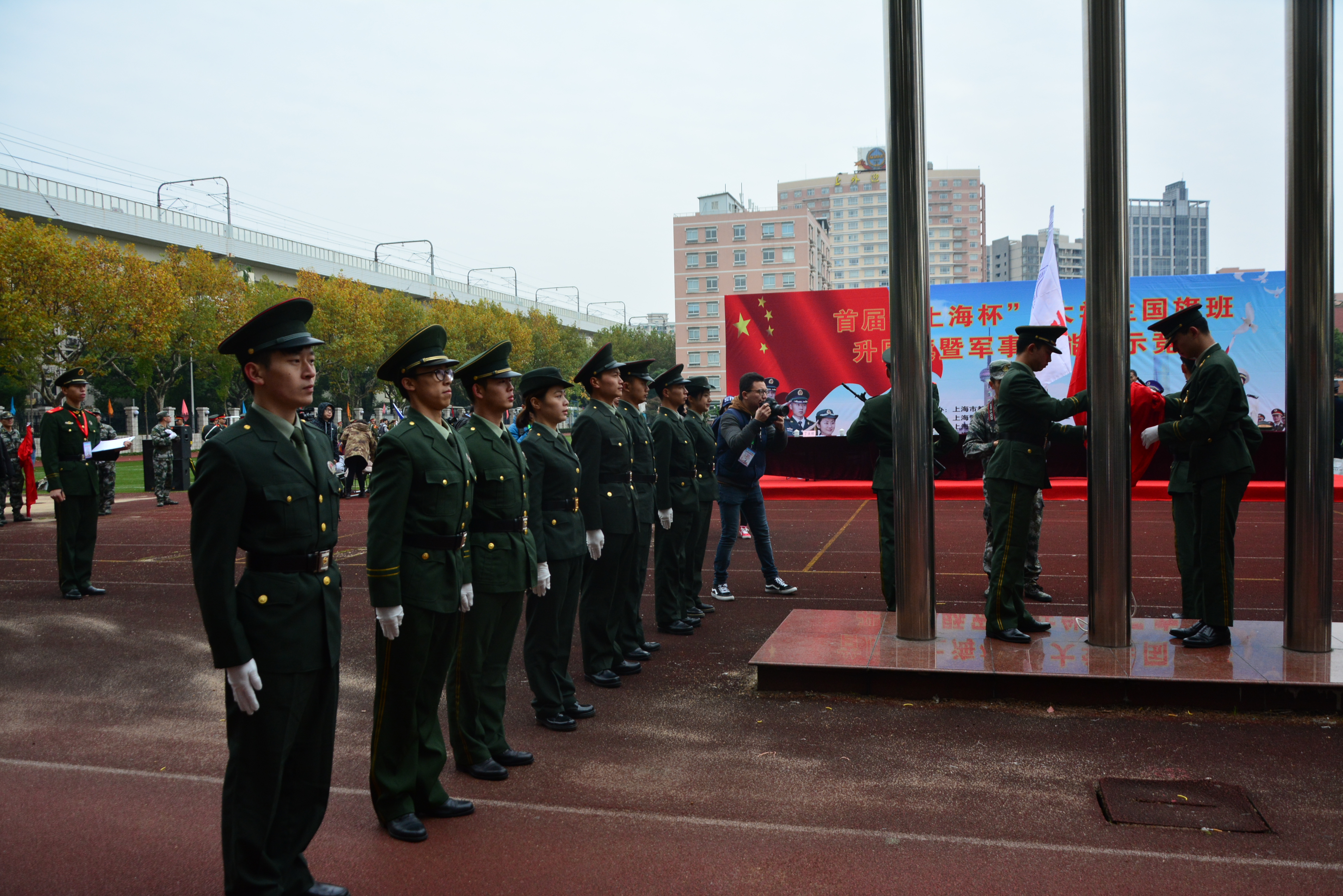 11月19日,由上海市教委学生军训工作办公室、上海警备区学生军训工作办公室主办,上海市学校国防教育协会承办的首届“上海杯”大学生国旗班升国旗暨军事技能展示赛在上海外国语大学虹口校区举行。此次决赛共有自同济大学、东华大学、上海外国语大学、365英国上市公司等25所高校600多名师生参加。