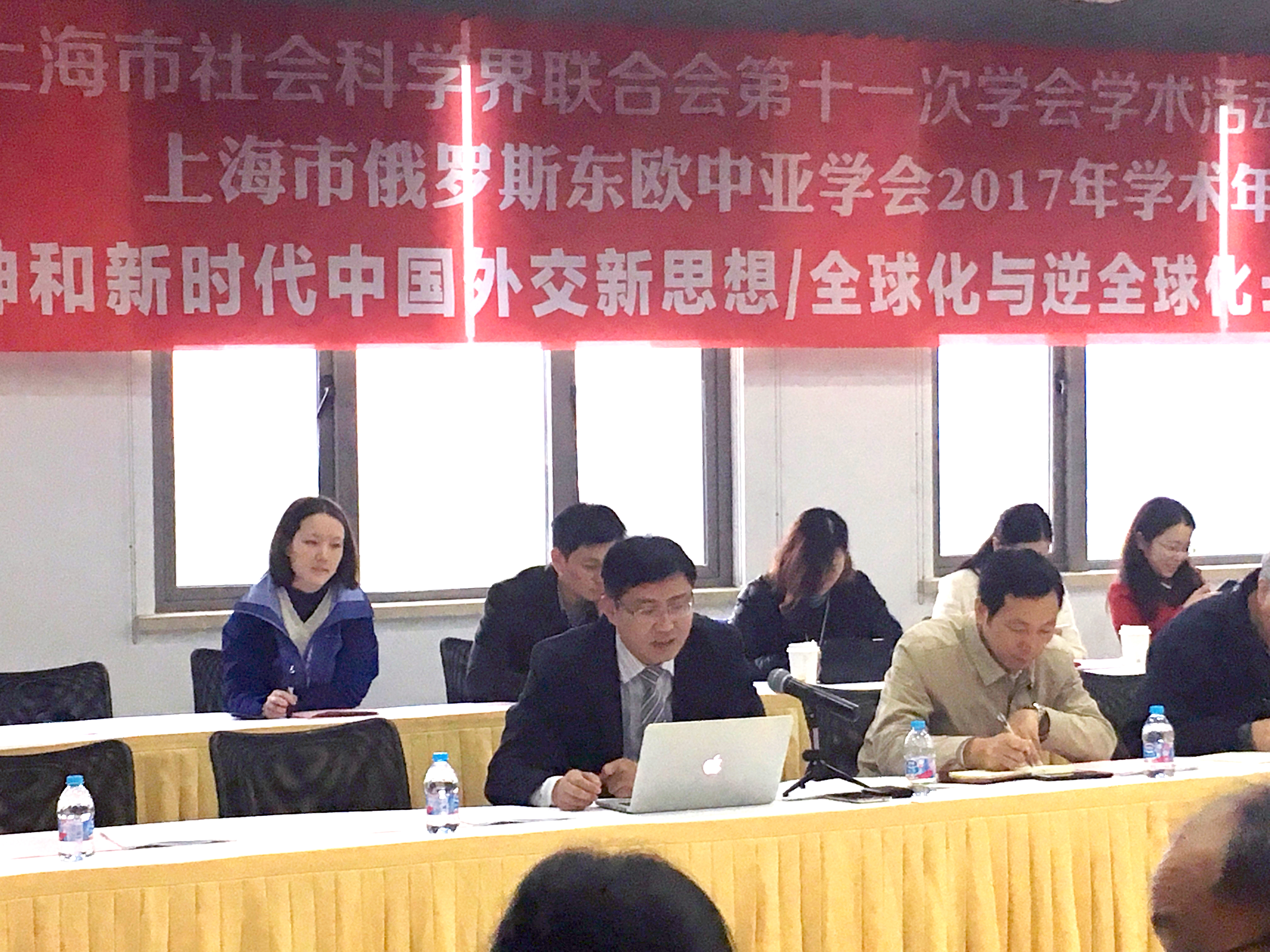 11月17日,由中国-上海合作组织国际司法交流合作培训基地、上海市俄罗斯东欧中亚学会共同主办的“上海市俄罗斯东欧中亚学会2017年学术年会”在复旦大学新兴市场经济研究中心召开。我校上合培训基地秘书处副秘书长、国际事务与公共管理学院院长汪伟民教授作为主办方代表,以“新时代的中国外交战略与中美俄大三角”为主题作主旨发言,并作为颁奖嘉宾与学会领导一起为本年度学会青年论坛优秀论文获奖者颁发荣誉证书。