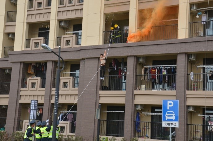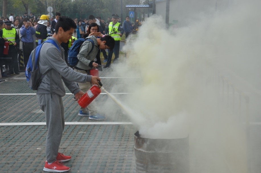 学校共有11层高层宿舍楼2幢、360余间学生宿舍,近1500名学生居住在这里,楼层高、人员密度大,消防安全工作开展遇到新的挑战。演习分为模拟火场、报警救火、有序疏散、火场逃生、高层救援五个环节。松江区佘山消防支队官兵开展了高层火场营救演示,保卫处微型消防站消防队员利用逃生缓降器对被火困在3楼的学生实施营救。随后,进行了消防灭火演示和实战演练。