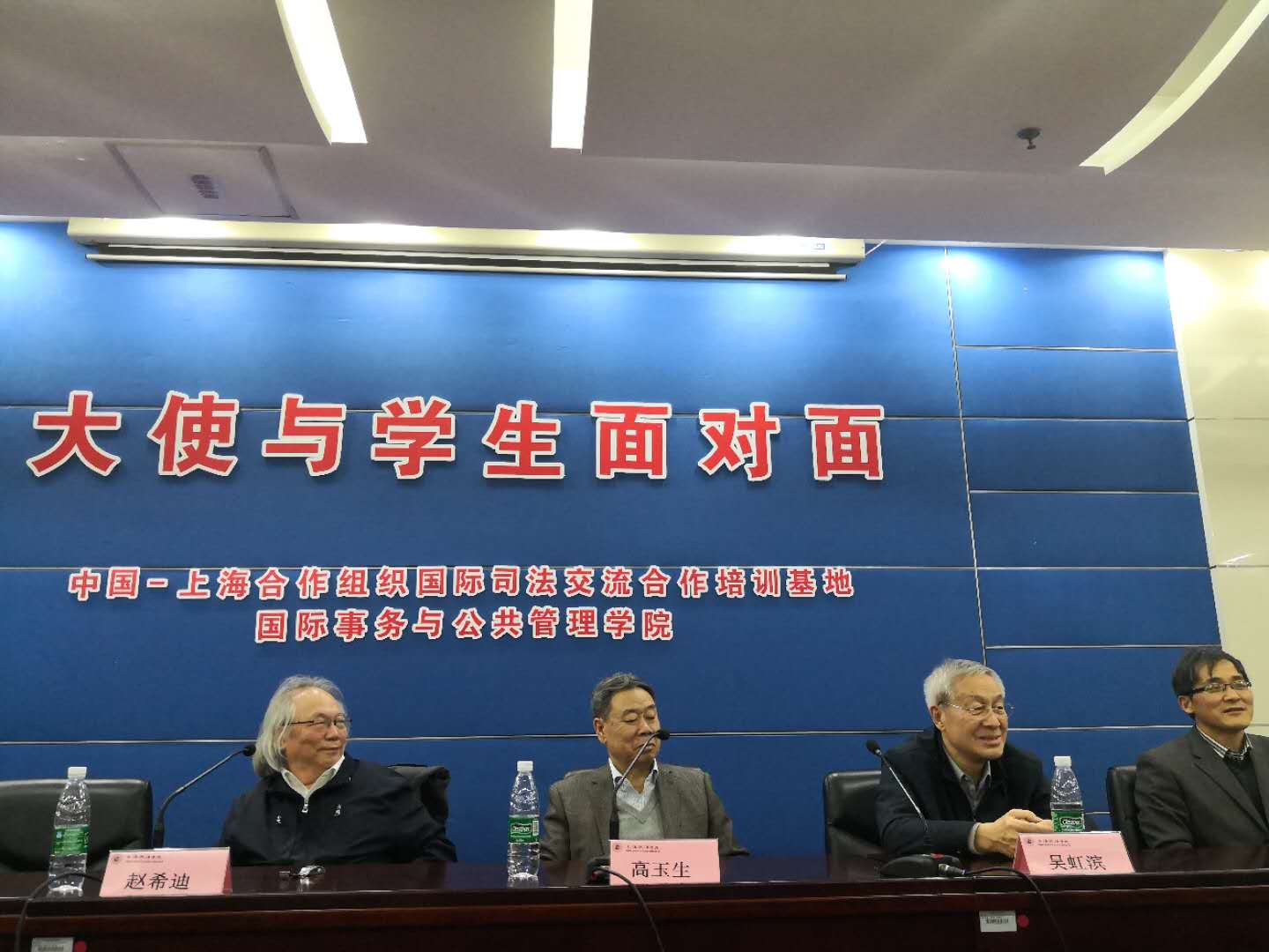 近日,我校中国-上海合作组织国际司法交流合作培训基地(简称“培训基地”)、国际事务与公共管理学院荣幸邀请到中国驻中亚国家的三位前大使莅临我校指导基地工作。三位大使驻访培训基地期间,为我校师生做了多场讲座和访谈,掀起了“大使旋风”。这是我校新近开展的“大使在上政”系列活动的首场秀,本次邀请到的三位大使分别是:驻乌克兰前大使高玉生、驻白俄罗斯前大使赵希迪、驻土库曼斯坦前大使吴虹滨。