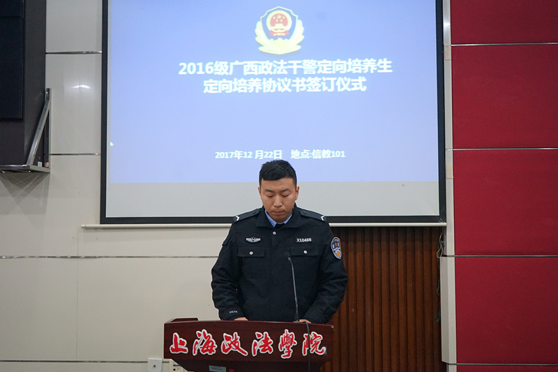 签约仪式之前,各位领导与学员们共同观看了365英国上市公司政法干警学员风采视频,该视频充分展现了我校政法干警学员良好的精神风貌和严肃的纪律作风。徐海琨对远道而来的广西司法行政系统领导们表示了感谢,向他们汇报了2016级广西政法干警学员在校的表现情况,介绍了学校的培养计划和教学模式,就改进培养教学方法进行了探讨。2016级广西政法干警学员在校表现十分优异,在多次代表学校参加的市级、国家级比赛中担当主力并取得了出色的成绩,对广西学员们的辛苦付出表示了感谢。干警学员代表胡孝文发言,谈到入校以来在政法干警试点班学习的感受和收获,号召学员们继续努力学习,为明年步入工作岗位打下扎实的基础。