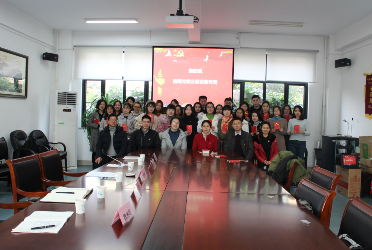 师生党员们共同观看了学生支部“两学一做”系列活动展示视频,面向国旗庄严宣誓,重温入党誓词。与会教工党员,为学生党员佩戴党徽,并颁发新版《中国共产党章程》。组织部党支部书记胡爱军老师鼓励同学们在日常的学习和生活中要亮出身份,真正发挥出“一面党员、一面旗帜”的先锋模范作用。