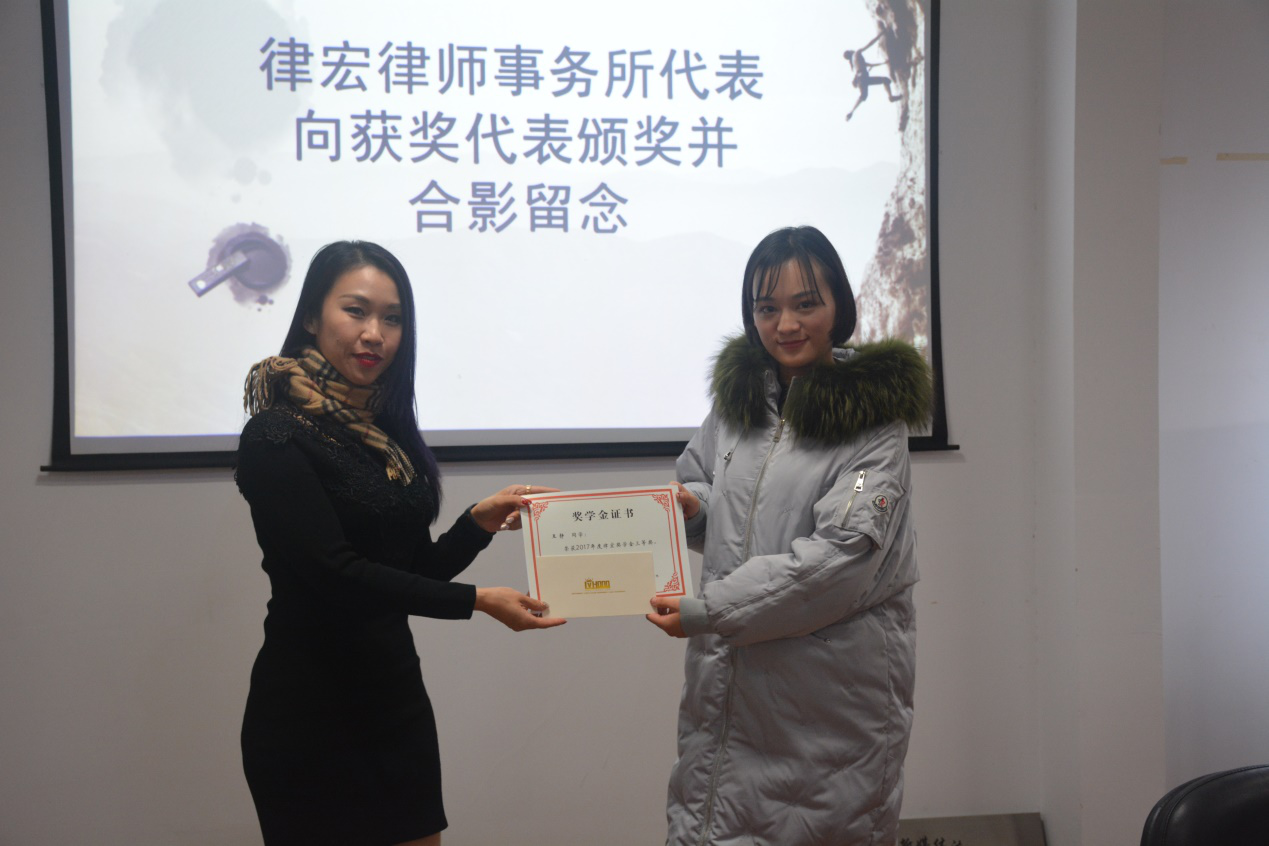 张顺芳代表学院奖学金评审小组向律宏律师事务所汇报了学院2017年度律宏奖学金的评审过程。2017年的律宏奖学金自去年11月份起组建评审小组、确定评比规则、发布通知、收取材料、评审小组评审、公示等步骤,历时两个月,最终11名本科生获评。随后,律宏律师事务所代表向获奖学生颁奖并合影留念。
