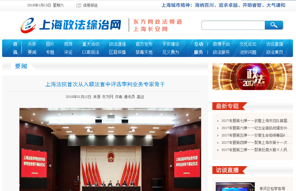 据上海政法综治网报道,1月12日下午,上海市高级人民法院举行了上海法院审判业务专家、审判业务骨干颁证仪式,这是上海法院推进司法体制改革、实施法官员额制以来,首次从入额法官中评选出的专家骨干。通过资格审查、评审公示等程序,我校原经济法系9232班校友、国家四级高级法官、现上海高院审管办副主任唐震及其他七位法官确定为首批上海法院审判业务专家。颁证仪式上,上海高院党组书记、院长崔亚东向8位审判业务专家颁发了证书。