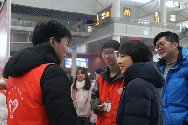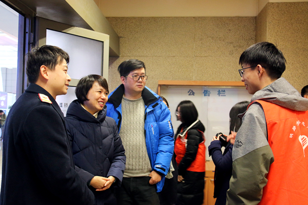 数九寒冬,滴水成冰,上海气象台已连续发布第七个霜冻警告。春运志愿者们利用寒假休息时间,投身于春运的人潮中,捋起袖子疏导人流,举起喇叭温馨提示,每天志愿服务长达12个小时。据悉,今年是我校志愿服务春运的第五个年头,服务时间将持续到腊月二十八,志愿者规模从高职学院扩大到法律学院和社会管理学院,还有中学生通过“青春上政”微信平台加入到志愿服务的行列中。上政青年们用志愿奉献春运,收获成长,更温暖了旅客们的回家路。(蔡雨晨、陈品凡撰稿 叶蕴蕙摄影)