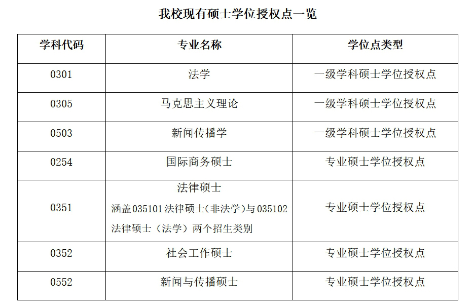 截至目前,我校共有三个一级学科硕士学位授权点、四个专业硕士学位授权点,详细情况请见下表: