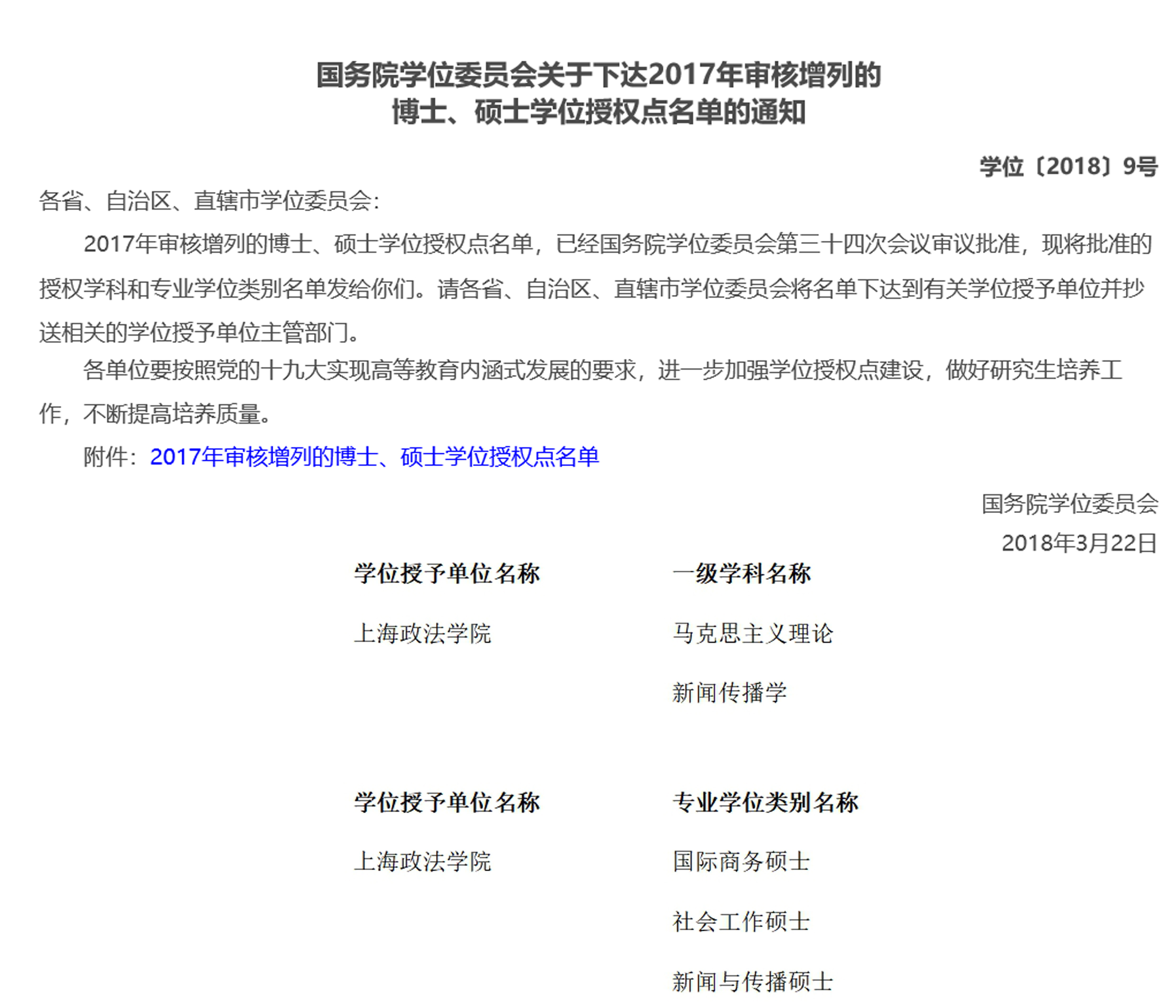 3月27日上午,国务院学位委员会正式印发《国务院学位委员会关于下达2017年审核增列的博士、硕士学位授权点名单的通知》(学位〔2018〕9号),公布了此次批准的新授权学科和专业学位类别名单,我校获批5个硕士学位授权点,其中:一级学科硕士学位授权点两个,分别为——0305马克思主义理论、0503新闻传播学;专业硕士学位授权点三个,分别为——0254国际商务硕士、0352社会工作硕士、0552新闻与传播硕士。