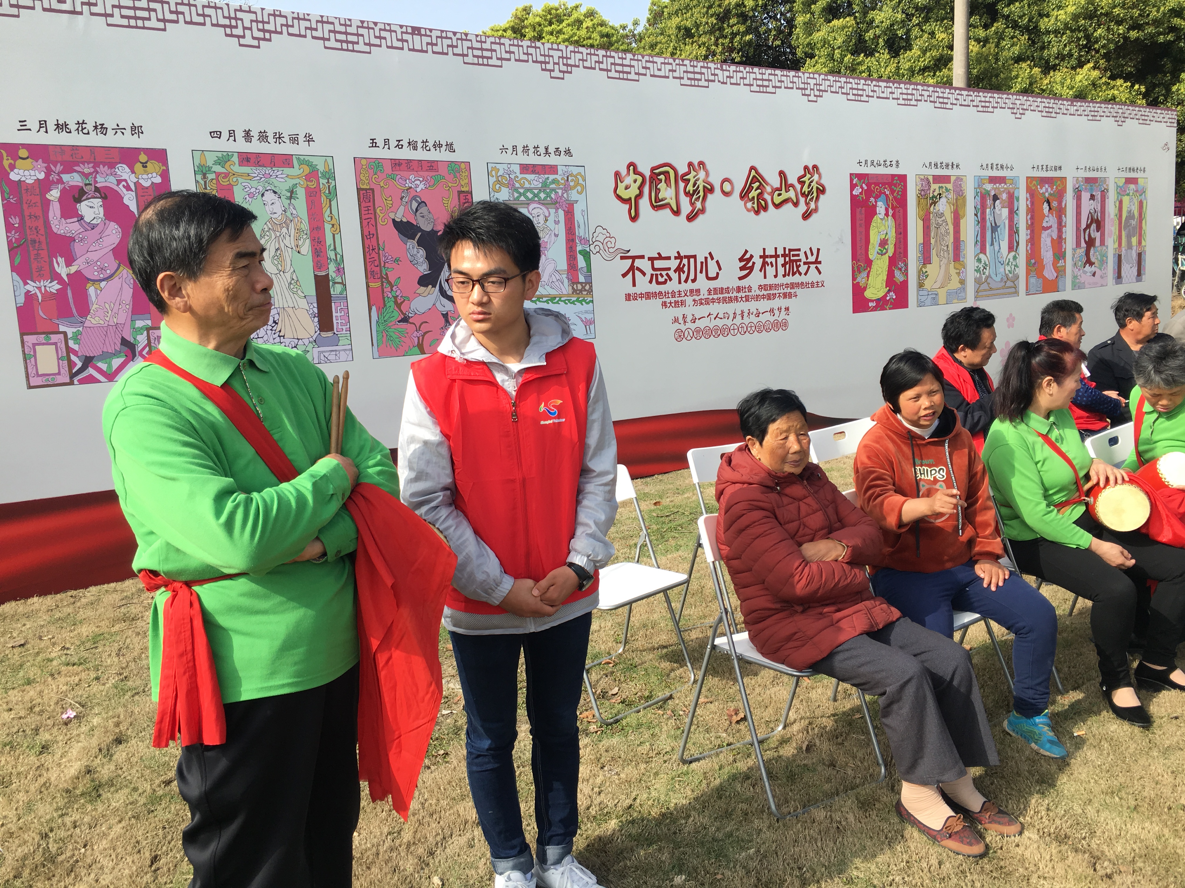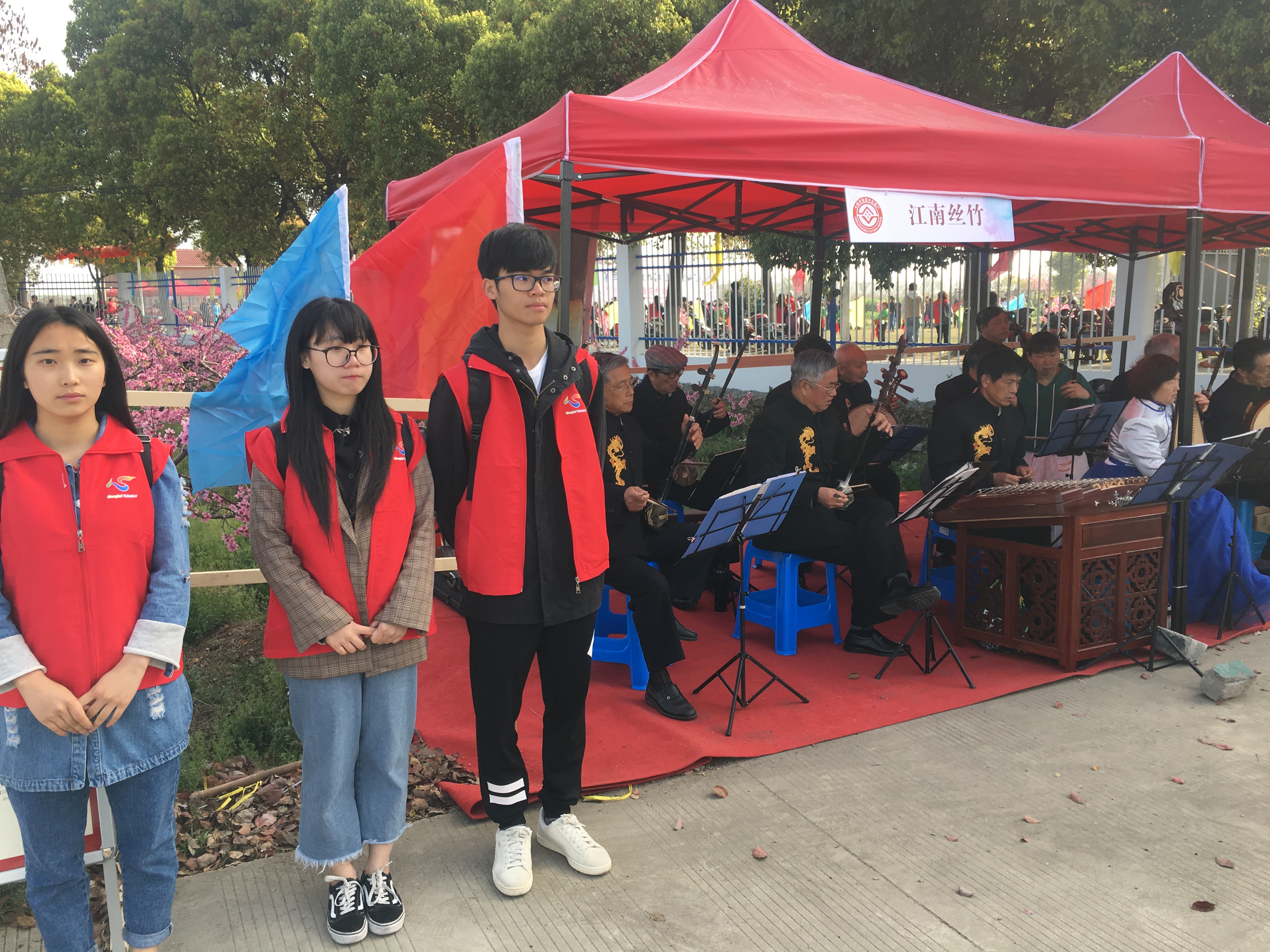 清晨,志愿者们组织有序地乘坐班车来到了松江区佘山镇新镇村桃花园。志愿者们有的在进出口引导游客出入;有的在表演场地迎宾并维持活动秩序;有的在路口为游客发放用于祈福的红符;有的指引游客在桃园祈福并拍照留念;有的在集市引导游客进行选购并维持集市秩序。表演结束后,志愿者们纷纷自发地帮助工作人员搬运工具并清整活动场地,认真勤劳、不怕苦不怕累的奉献精神。