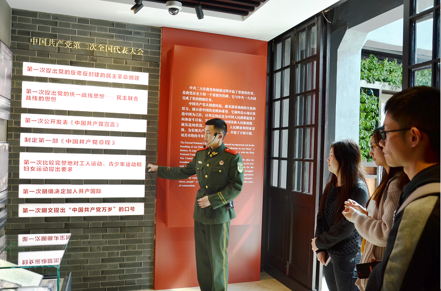 在志愿者的讲解中,党员们依次参观了二大会址纪念馆的五个展区,回顾了中国共产党的创建历史及老一辈无产革命家的奋斗历程。全址共由序厅、中共二大展厅、党章历程厅、中共二大会议旧址、平民女校旧址五个展区组成。在序厅,讲解员向学生党员们介绍了二大会址的整体结构,通过微电影,学生党员们对中共二大前后的历史背景、会议章程及出席人员有了初步的了解。在党章历程厅,陈列着自中国共产党成立以来历次党的全国代表大会通过的党章和内容简介,“党章集锦墙”上展出了纪念馆收藏的各个历史时期、各个版本的党章,学生党员们翻阅展厅墙壁上的电子显示器,阅览不同时期的党章,了解各个时期党章内容,从中体会党的发展历程。“平民女校”展厅重现我党第一个培养妇女干部的学校风貌,厅内展出了当时的学员物品、教室和照片展现了当年的历史背景下革命女性追求真理的精神,学生党员们驻足观看、交流讨论。