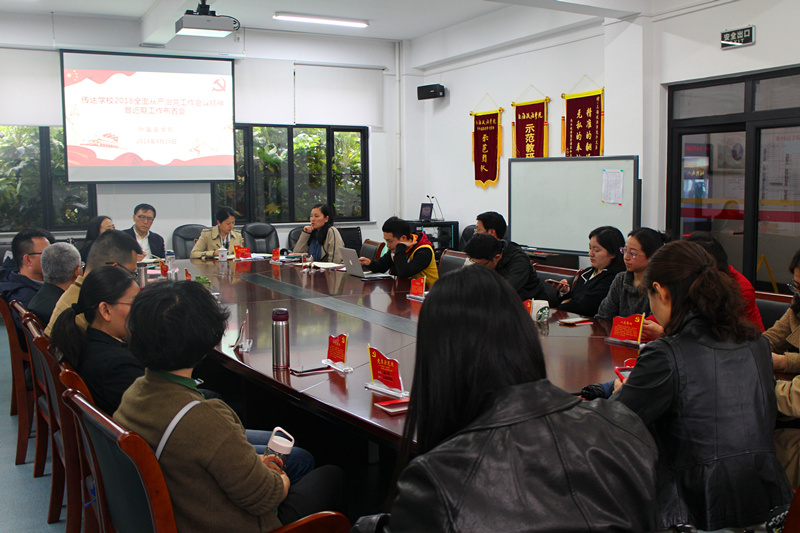 4月24日下午,外国语学院在A1-101会议室召开全体教职工大会,传达学习了学校全面从严治党暨年度工作会议精神,并对近期工作进行布置,会议由党总支书记姚善英主持,全体教师参加会议。