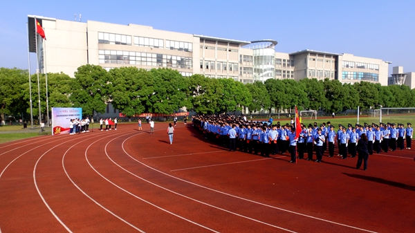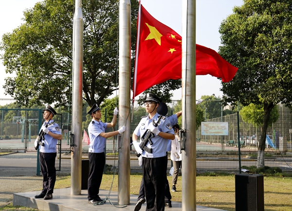 早上6时50分,参与活动的全体学生佩戴好团徽、手持红旗,自觉肃立。7时,在全体师生的注目下,国旗护卫队队员护送五星红旗入场。伴随着嘹亮的国歌声,五星红旗冉冉升起,迎风飘扬,全体师生行注目礼,深怀着对祖国的热爱和崇高敬意。