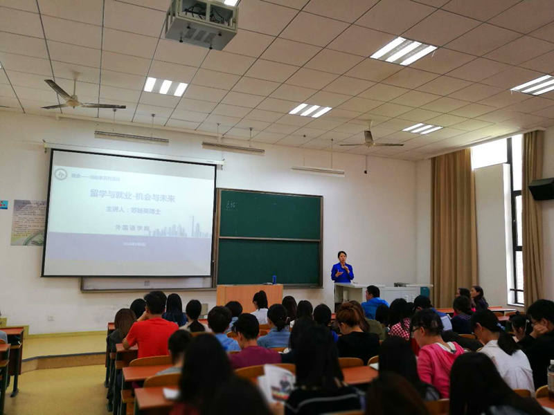 为进一步加强对学生的就业指导,开拓学生国际化视野,5月8日下午,外国语学院在A8-101举办了“远航·充分就业季”系列活动第二场——留学与就业:机会与未来专题讲座。党总支书记姚善英主持此次活动,约150名学生参加了本次活动。