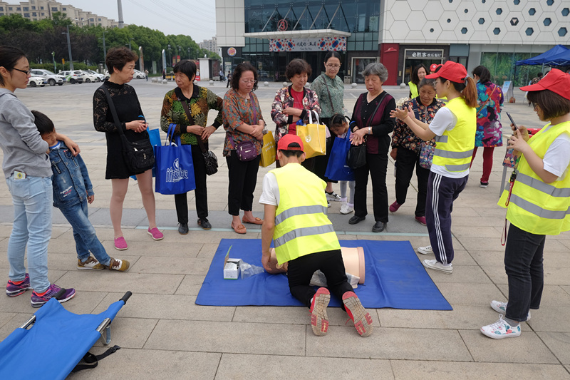 在应急救护区域,很多市民兴趣浓厚地按照学生志愿者的演示和手把手辅导来学习心肺复苏各步骤,也有老人在看了学生的展示后来体验身体相关部位受伤后如何包扎固定的方法。