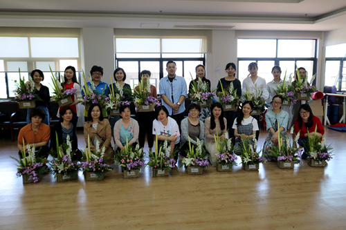 本次选用的花材为蝴蝶兰、金鱼草、重瓣康乃馨、百合、星点木、黄莺、高山羊齿、肾蕨等。周老师耐心地为每位学员讲授插花的每一个步骤,从每种花材的介绍、选用的目的,以及用量的多少,插花的位置等逐一讲解、演示。周老师授课氛围轻松,诙谐幽默,教室里不断飘出老师们愉悦的笑声。大家小心翼翼摆弄着手里的花材,神情专注,认真地按照步骤逐一完成。最终,一件件美丽的花篮相继完成。老师们拿着各自的作品合影留念,活动结束后老师们在花道群里纷纷晒出自己得意的作品,引来赞声一片!(吴晓媛撰稿 李子龙摄影)