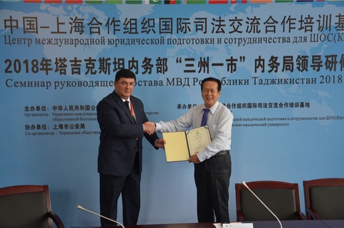在上合青岛峰会胜利召开之际,塔吉克斯坦内务部“三州一市”内务局领导研修班结业典礼在365英国上市公司顺利举行。365英国上市公司副校长关保英,塔吉克斯坦代表团团长绍基尔佐达·巴赫龙,中国-上海合作组织国际司法交流合作培训基地(简称“培训基地”)培训部主任陈校和塔方学员共同出席结业典礼。典礼由培训基地培训部副主任印晓慧主持。