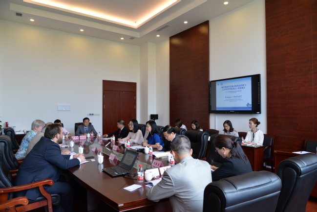 俄罗斯联邦总统直属国民经济与公共管理学院代表团成员——副校长马戈林、国际关系学院国际硕士课程项目主任安德烈、国际关系学院汉语教研室主任叶卡捷琳娜,我校国际交流处处长、国际交流学院院长欧阳美和,研究生处处长赵俊,经济法学院院长胡戎恩,国际交流处王瑶,上合培训基地姜思源、王雅鹃等参加了会谈。