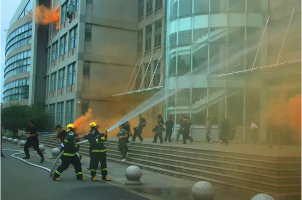 军训团副团长、保卫处处长、演习现场指挥郭玉生主持消防逃生演练,这是我校第11年在军训中进行消防疏散逃生演习。点火、警报拉响,主教学楼烟雾四起,学生从教学楼紧急向体育场指定地点疏散集结,佘山消防中队消防队员进行灭火救助。整个过程迅速有序,各排同学按照逃生演练的规定路线,在确保安全的情况下,以最短的时间逃离了教学楼,高质量地完成了疏散逃生任务。