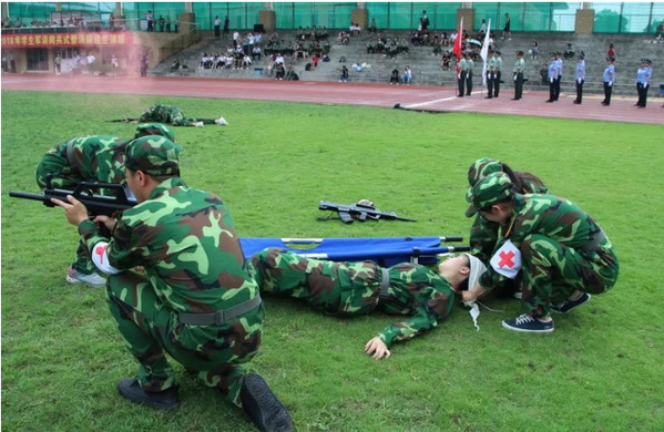 紧接着,从经济管理学院调160名精英学生组成红蓝两方进行步兵排平原进攻战斗演习,融合了战地扎营、构筑工事、战伤救护、平原攻防,以及战术基础动作等课目。首先,3个班在操场南侧演示的是战地扎营,另外3个班操场北侧同步开始构筑防御工事。战地防御搭建完毕后,红方蓝方分为进攻方和防守方同时跑步入场开始班排战术表演。红方作为进攻方,跃进、卧倒、匍匐,各种战术动作一气呵成,展开队形、正面猛攻、迂回包抄,各种攻击战法合理运用,突破了蓝方的一道道防线。最后,步兵排平原进攻战斗,以红方的全面胜利宣告结束。攻防期间,8名同学组成的医疗救护队担任“战场救护任务”,4名负责抬担架,2名负责射击掩护,到达伤员地域后,2名担架手检查伤势,迅速包扎后,并协力将伤员抬上担架,快速撤出场地。整个过程迅速有序,高质量地完成平原进攻战斗演习。