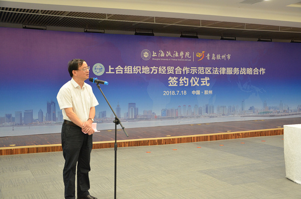 签约仪式前,双方观看了中国-上海合作组织国际司法交流合作培训基地宣传片并参观了胶州国家经济技术开发区。仪式上,孙永红简要介绍了胶州市关于推进上合组织地方经贸合作示范区法律服务保障工作的情况,并在致辞中指出,作为“一带一路”双向桥头堡和示范区所在地,胶州市倍感振奋、备受鼓舞,为了积极贯彻落实习近平总书记上合组织青岛峰会重要讲话精神,希望双方将在战略决策咨询、研究平台和高端智库建设、人才培养与交流、优势资源互联互通等方面深化合作,共同推动上合组织地方经贸合作示范区加快前进。