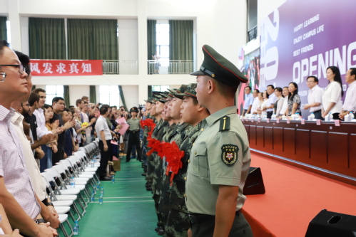 典礼伊始,刘刚呼吁全体新生牢记历史、勿忘国耻,只有强大的国防力量才能保障我们今天的美好生活。刘刚提议全体新生为今年新入伍的31名同学起立鼓掌,31名新兵也用嘹亮的口号回应在场的上政学子,会场洋溢着青春与热血!