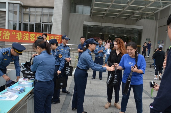 活动中,执法队员和保卫处工作人员们一起发放“交通出行手册”“谨防‘克隆’出租车”“你打的是合法网约车吗?”“乘坐非法营运‘黑车’的危害”等多种设计精良的拒乘“黑车”宣传手册和倡导“绿色交通、文明出行”的纪念物3000余份、环保袋500余个及各类公益宣传品1800个,引来众多学生包括留学生等驻足参与,热情互动。