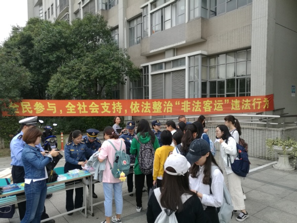 按照市整顿交通秩序联席办《关于开展本市第四届“拒绝黑车‘进学校’交通安全记心上”主题宣传活动的通知》和市教委的统一部署,10月9日,我校保卫处与青浦区联席办在校内联合开展整治非法客运暨“拒乘黑车‘进学校’交通安全记心上”主题宣传活动。青浦区交通委执法大队盛国梁大队长、顾斌副大队长,我校保卫处郭玉生处长及相关工作人员参加,青浦区电视台报道了此次主题宣传活动。