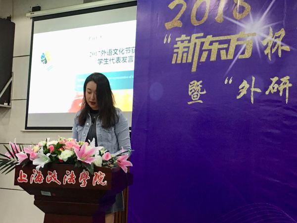 2017年外语文化节获奖学生代表胡怡慧同学发言,她表示,“作为一名观众,我被外语文化节的精彩活动所吸引;作为一名参赛选手并代表学校获得荣誉,我感到十分的荣幸;看到外语文化节的再一次开幕,作为曾经亲身参与到外语文化节的亲历者,我感到十分的自豪。外语文化节的参赛体验将会是我大学生涯中一段难忘的回忆”。