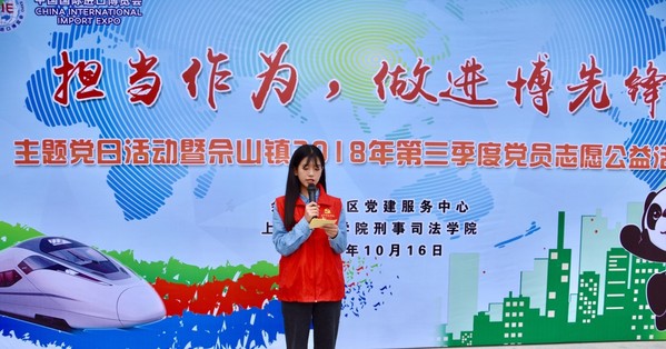 10月16日下午,在首届中国国际进口博览会倒计时20天之际,刑事司法学院本科学生党支部与佘山镇社区党建服务中心共同开展“担当作为,做进博先锋”主题党日活动暨刑事司法学院进博会志愿者宣誓仪式。活动由佘山镇社区党建服务中心负责人沈爱娟主持,刑事司法学院-警务学院党总支副书记徐海琨出席,学生党员、进博会志愿者、入党积极分子及佘山镇社区党员志愿者50余人参与此次活动。