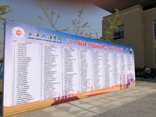 10月30日下午,我校2019届毕业生秋季校园招聘会在训练馆举行。招聘会现场有来自政法机关、国有大中型企业、“三资”企业、银行金融机构、法律服务机构、大中型人力资源公司、上海市人才行业协会推荐的会员单位和校友会推荐的企业、二级学院邀请的用人单位以及校友用人单位等261家单位济济一堂,带来了近4000人次的招聘岗位。