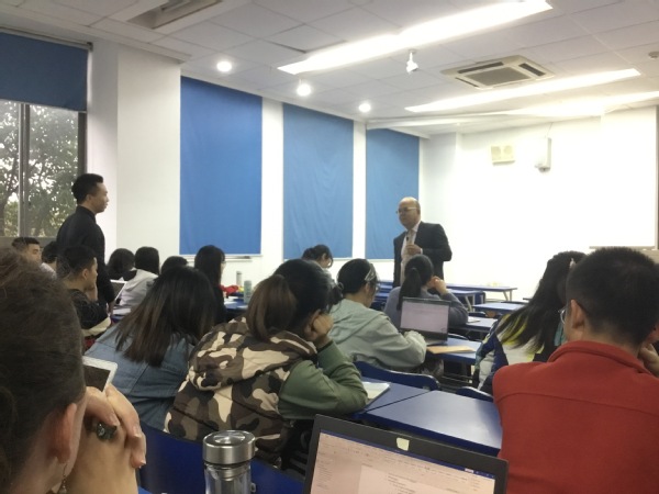 会见结束后,Mark Koulen于庸夫楼206室开展了题为“世界贸易组织与国际经济法律制度”的讲座,向学生阐释了多边贸易体系面临的现状以及面临的挑战,未来的中美关系以及世贸组织改革与贸易协定。讲座后,Mark Koulen热情解答学生问题,并就一带一路、世贸组织、跨太平洋伙伴关系协定等相关问题提出了独到见解。