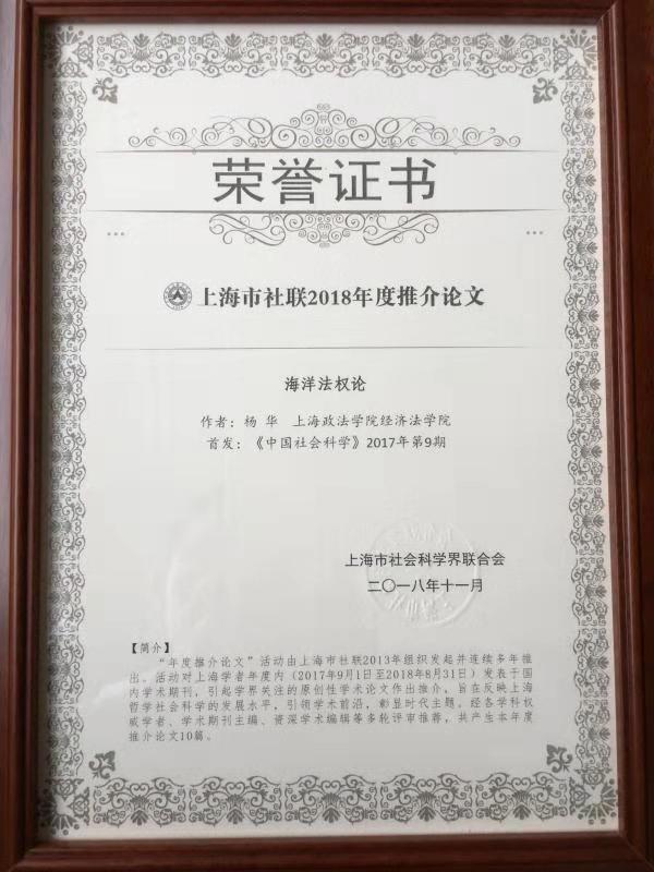 年会设“年度推介论文”活动,对上海学者年度内(2017年9月1日至2018年8月31日)发表于国内学术期刊,引起学界关注的原创性学术论文作出推介,旨在反映上海哲学社会科学的发展水平,引领学术前沿,彰显时代主题。经各学科权威学者、学术期刊主编、资深学术编辑等多轮评审推荐,共产生本年度推介论文10篇。我校经济法学院副院长杨华教授的发表于《中国社会科学》2017年第9期的《海洋法权论》获得第14届(2018年)上海市哲学社会科学优秀成果一等奖,并入选“年度推介论文(法学类)”。