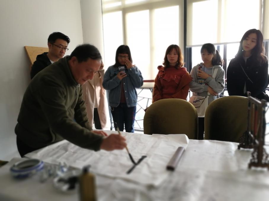 在互动阶段,老师和学生们向王教授请教了书法学习中的问题,王教授一一作答,并与大家分享自己练习和教授书法的心得与经验。现场互动频频,气氛热烈。最后,王教授挥毫做了现场示范,把讲座的气氛推向高潮。