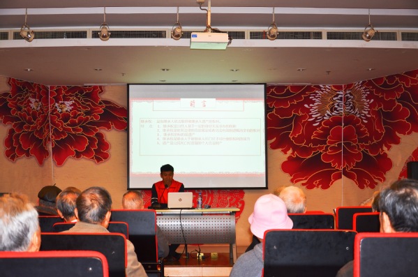 普法讲座中,冯心颖、周优优、杨宗昌、许姗四位研究生党员,分别从侵权、赡养、继承、遗嘱四个方面,为在场将近30位老人作了长达一个半小时的普法讲座。