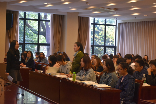 在《高级英语》课堂上,夏甘霖从图片和头脑风暴切入主题,引导学生寻找语篇中的各种逻辑关系,并运用微信、在线语料库等现代化手段开展paraphrase、词汇搭配学习,让学生在做中学,培养了学生独立学习能力和问题研究能力;黄红伟的《大学英语》视听说课程从sharing到listening再到viewing,结构清晰流畅,用问题启发学生导入主题,同时又对听力策略加以总结,最后以学生的口语讨论结束,各项技能训练时间分配合理,节奏把握游刃有余;孙盛囡的《日语》课则从一段视频引入本节段的主题:对话中的随声附和,运用各种不同场合下的对话让学生直接感受日语在这些语境中的细微差别,最后引导学生自己总结归纳语言特点;刘静娟的《俄语》课以普希金《冬天的道路》这首诗为核心,介绍了俄语诗歌的音韵规律和诗歌的基本知识,并利用音视频、图片等手段引导学生体味诗歌所表达的意境,给人以美的享受。最后,姚刚从学习、科研、自然环境、社会现状等方面分享了他在英国南安普顿大学访学的经历,语言风趣幽默。