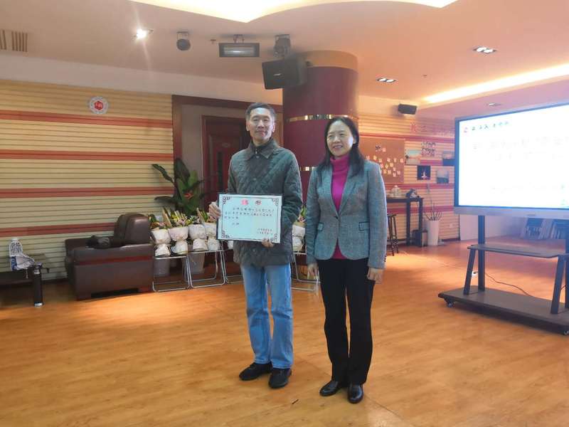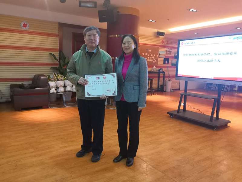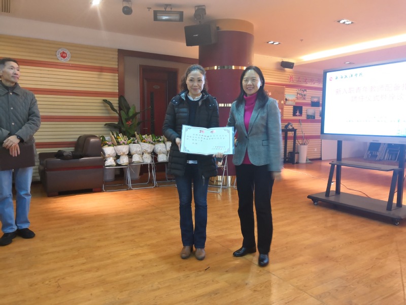 聘任仪式上,胡继灵依次为指导教师颁发聘书,青年教师为指导老师献上鲜花。