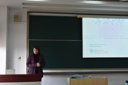 12月17日上午,上合组织培训基地海外驻访学者,芬兰拉普兰大学法学院院长、商法学教授Soili Nystén-Haarala在信教312教室做了一场别开生面的讲座: Challenges of Public and Private Regulation for International Business(公法和私法规制对国际企业的挑战)。讲座由国际法学院宋俊荣副教授主持。