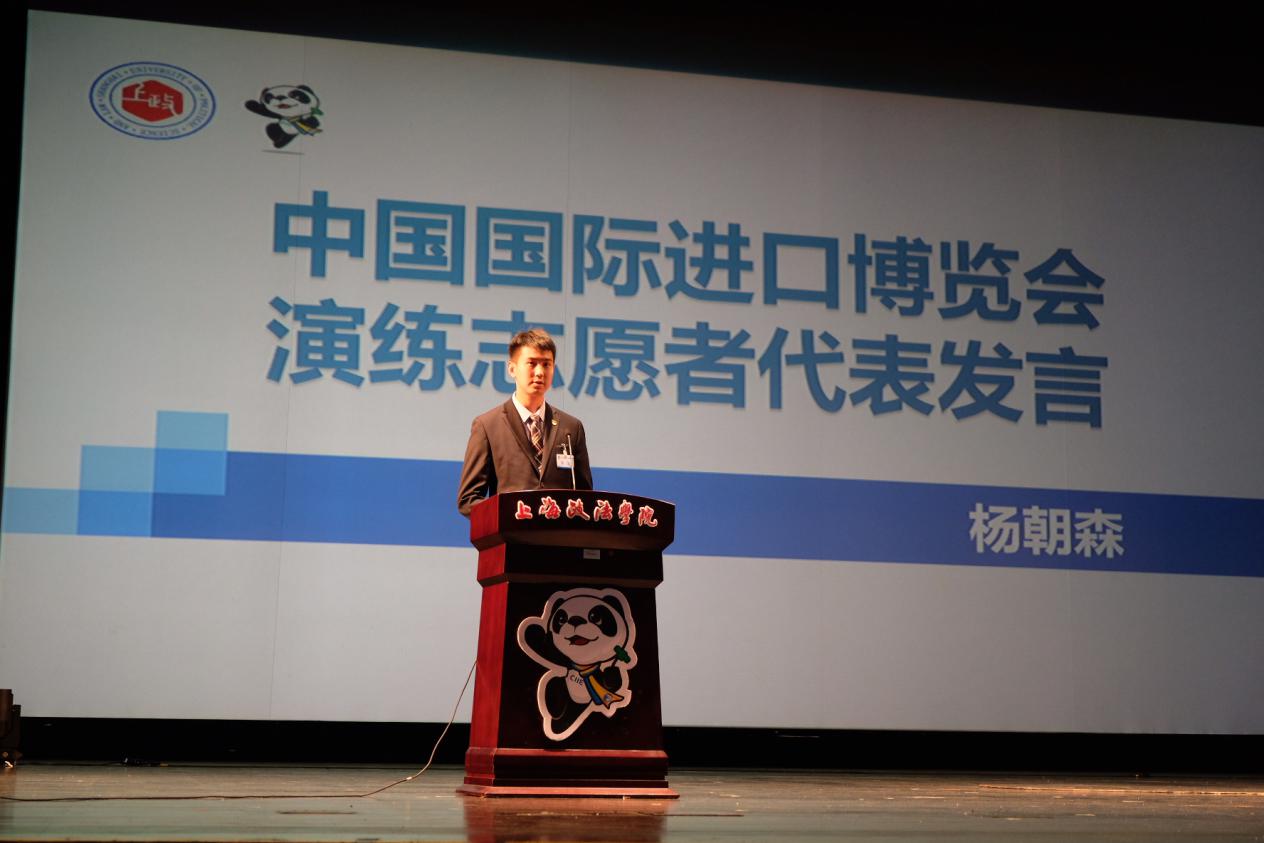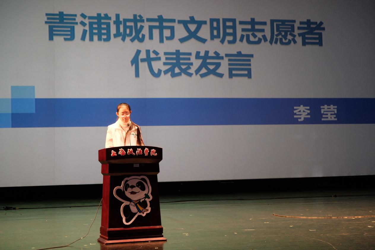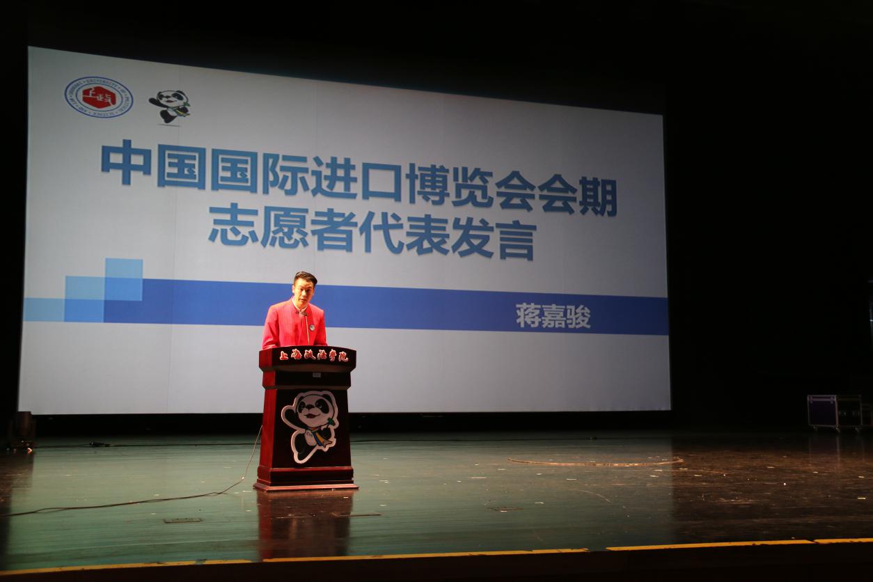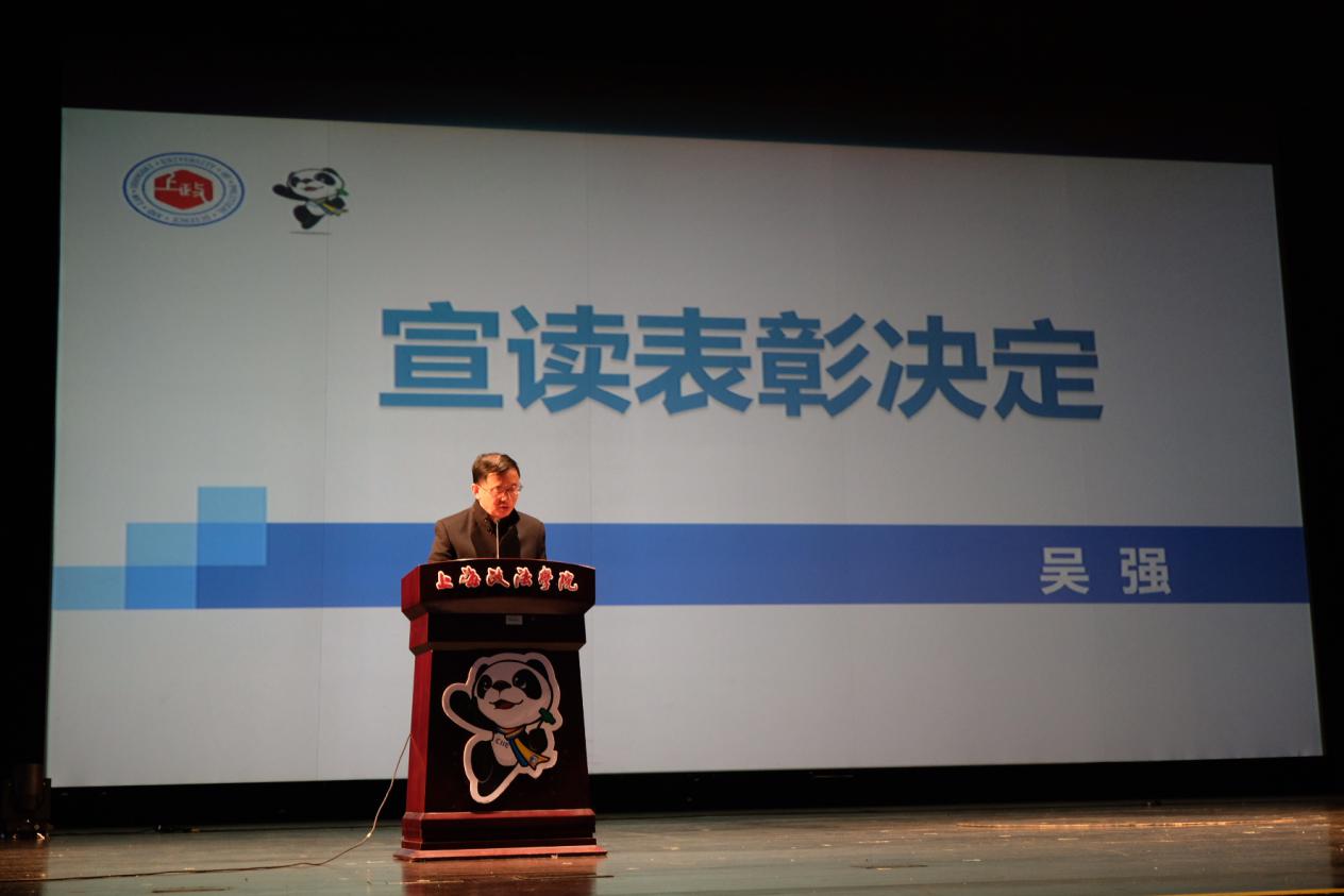 吴强代表学校宣读了《关于给予我校安景絮等740名志愿者通报表扬的决定》,充分肯定了我校大学生志愿者们在不同的岗位上以高度的政治责任感、使命感和为首届中国国际进口博览会提供了有温度、有力度的服务保障,勉励全校学子学习“小叶子”有温度、有担当、真情奉献的志愿服务精神,积极主动、服务大局的思想意识,学习“扣扣子”“担担子”“钉钉子”的拼搏勇气,在志愿服务的生动实践中实现青春梦想。