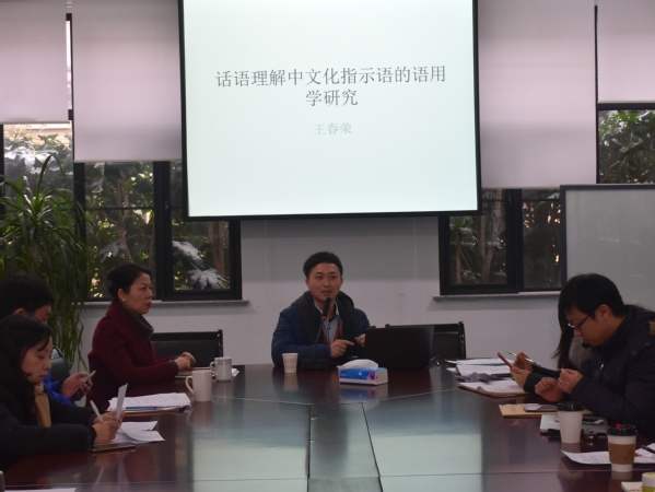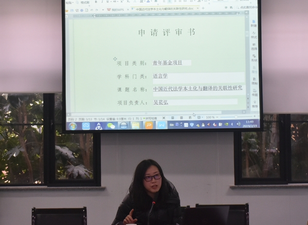 青年教师吴苌弘、王春荣作科研项目申报经验分享。吴苌弘分享了自己多年来申报课题、填写课题申报书的经验。她以2017年成功申报的教育部人文社会科学研究项目《中国近代法学本土化与翻译的关联性研究》的项目申请书为蓝本,从项目选题、文献综述、申报书重点内容的填写等方面与现场的各位老师进行了交流。同时,她又从不同的视角分析了申报书填写过程中需要着重关注的事项。王春荣以《话语理解中文化指示语的语用学研究》为例,与全体教师交流申报经验。他首先谈了国内外研究综述,接着阐述了课题的研究对象,最后他结合课题拟定的理论框架做了语用分析和解释。