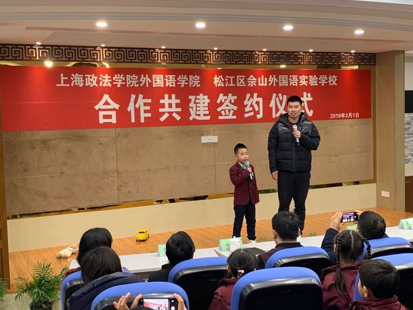 签约仪式上,双方签署合作共建协议。佘山外国语实验学校学生带来精彩的外语节目--英语绘本剧表演和英语演讲《My English Dream》,地道的口语和绘声绘色地表演,充分展示了孩子们对英语学习的热情和学校的教学成果。