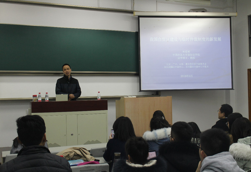 3月7日晚,中国政法大学国际法学院宋连斌教授应邀访问中国-上合基地,并在主教118A作了题为“我国自贸区建设与临时仲裁制度的新发展”的学术报告。上海外国语大学闫卫军教授、华东政法大学司文博士,以及我校60余名师生参加了讲座,讲座由我校国际法学院许庆坤教授主持。