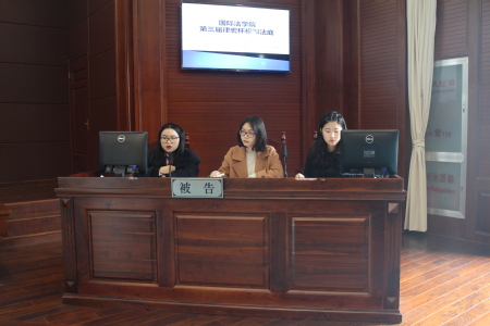 3月30日,国际法学院在法学楼B4模拟法庭举办了“第三届律宏杯模拟法庭比赛”活动。本次活动由国际法学院和上海律宏律师事务所共同主办。上海律宏律师事务所主任律师王夏青、高级合伙人黄冬艳、资深律师朱沙、杜佳华,国际法学院党总支副书记张顺芳出席。