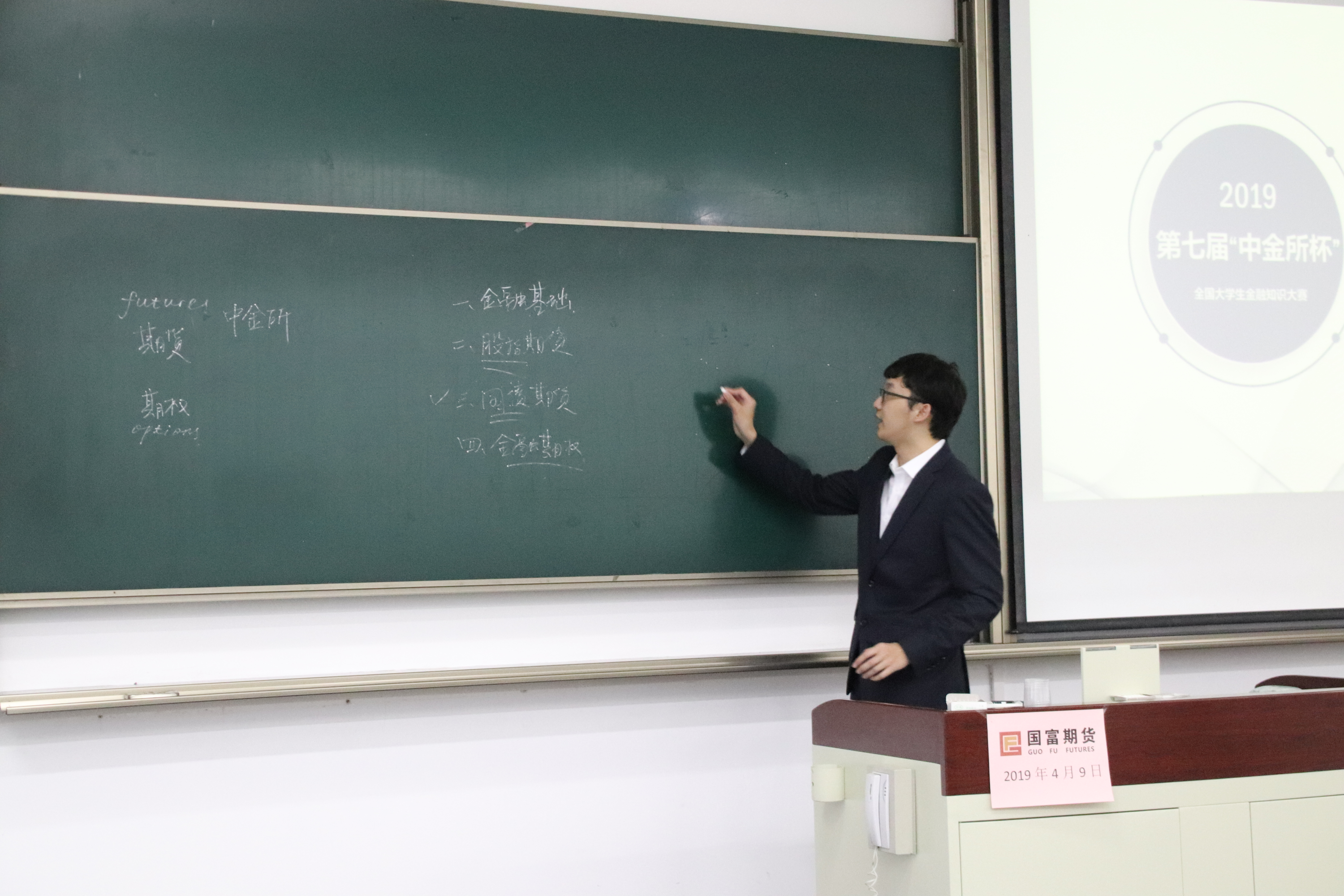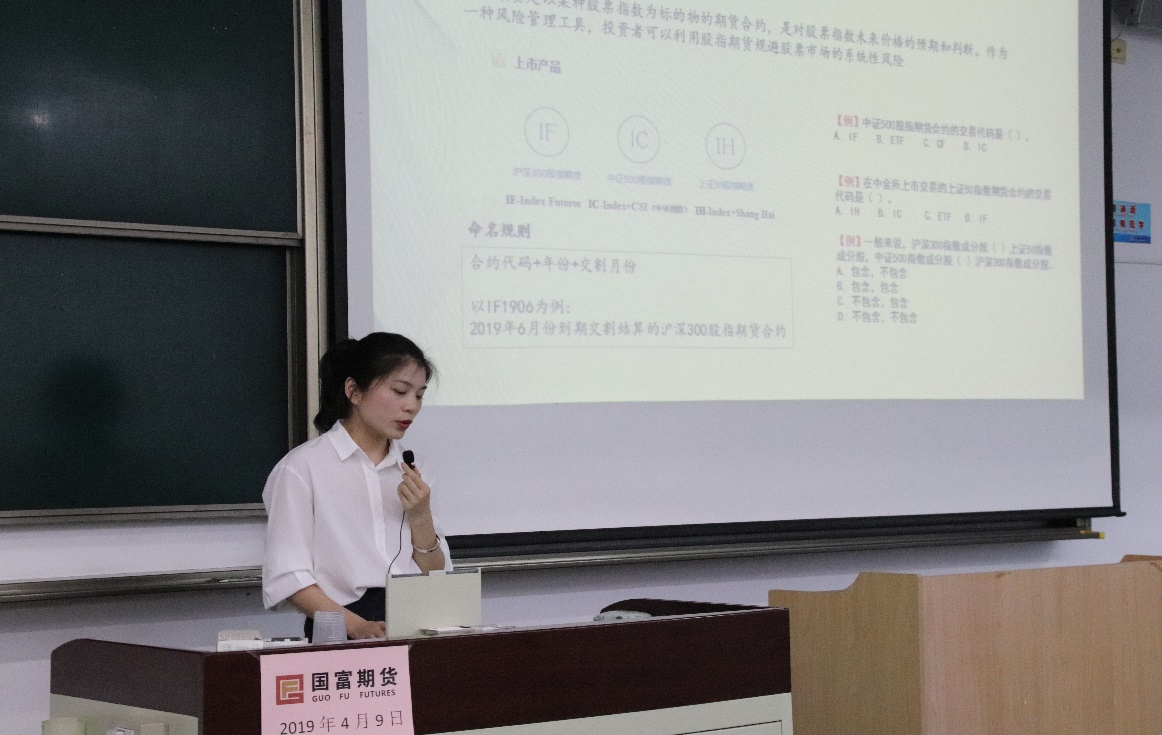 主办方老师介绍宣讲会目的以及本次“中金所杯”全国大学生金融知识宣讲会的特点。国富期货的孙燕老师讲述了股指期货的基础知识,国富期货的姚晓晨老师介绍了债券定价与国债期货基础。在讲述过程中,与同学们积极互动,有问有答。最后,主办方老师简述了本次大赛前的主要课程为六个方面:金融基础、股指期货、国债期货、金融期权、外汇期货和衍生品。