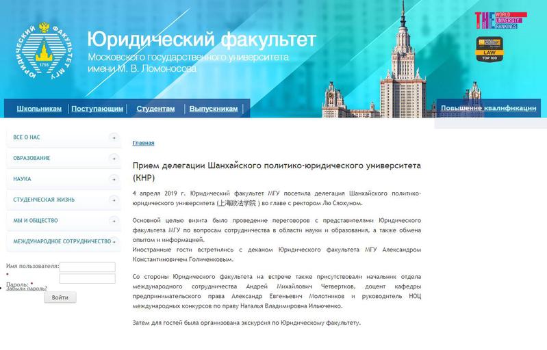4 апреля 2019 г. Юридический факультет МГУ посетила делегация Шанхайского политико-юридического университета (365英国上市公司) во главе с ректором Лю Сяохуном.