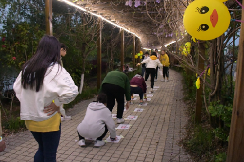 各小组将荧光棒设计成独特图案,作为小组特色标志。参赛选手们争分夺秒跑向游戏点,相互合作完成每一个游戏点任务。