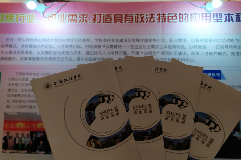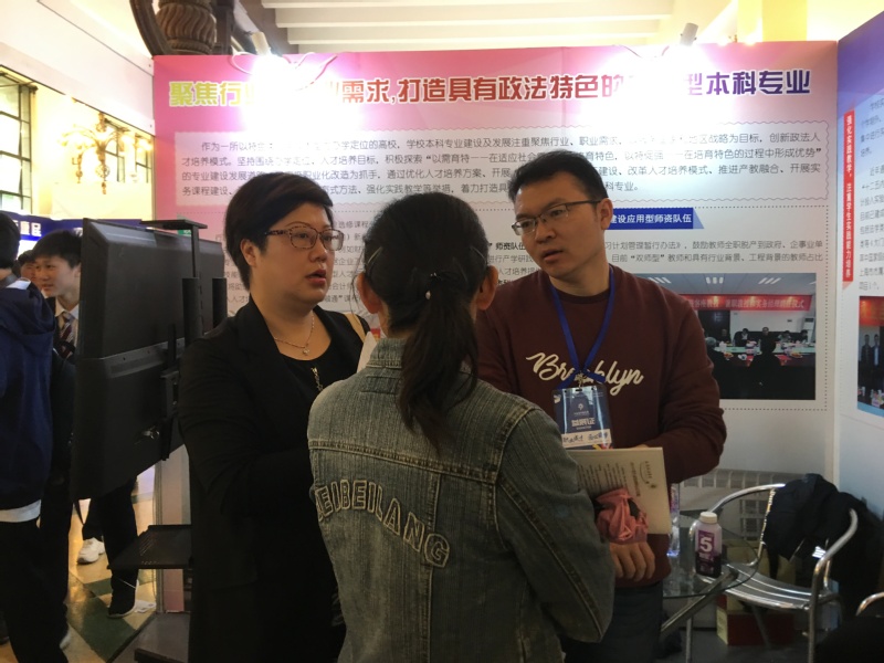 我校展区位于展示区域的中心通道处,人流密集。通过图文展板、视频播放、材料发放和咨询接待的形式,集中展示了我校以实施职业化改造为抓手,通过优化人才培养方案、开展“双师型”师资队伍建设、改革人才培养模式、推进产教融合、开展实务课程建设、改革课程教学及考核方式方法、强化实践教学等举措,着力打造具有上政特色的应用型本科专业。
